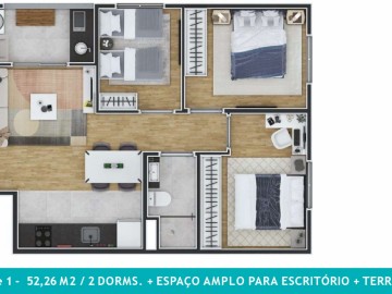 52,26M2/2 Dormitórios + Espaço Amplo para Escritório +Terraço Grill