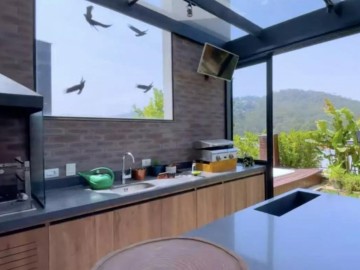 Churrasqueira e varanda gourmet com cobertura e fechamento em vidro (uma churrasqueira carvão e uma gás)