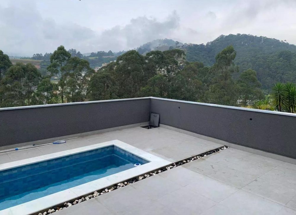 Na parte exterior (fundos) da residência ha uma sacada voltada para área gourmet completa integrada a piscina com 22 m².