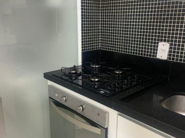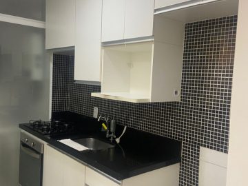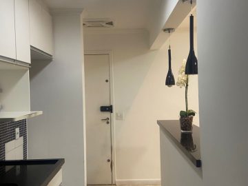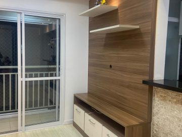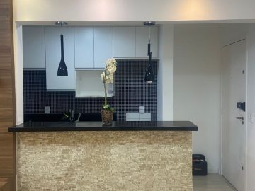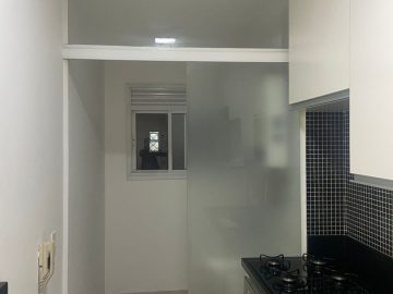 Cozinha com móveis planejados,  Área de serviço com divisaria de vidro2 dormitórios  móveis planejados,1 banheiroSala com espelho e painel , Varanda envidraçada com vista para a área de lazer 1 vaga livre e coberta